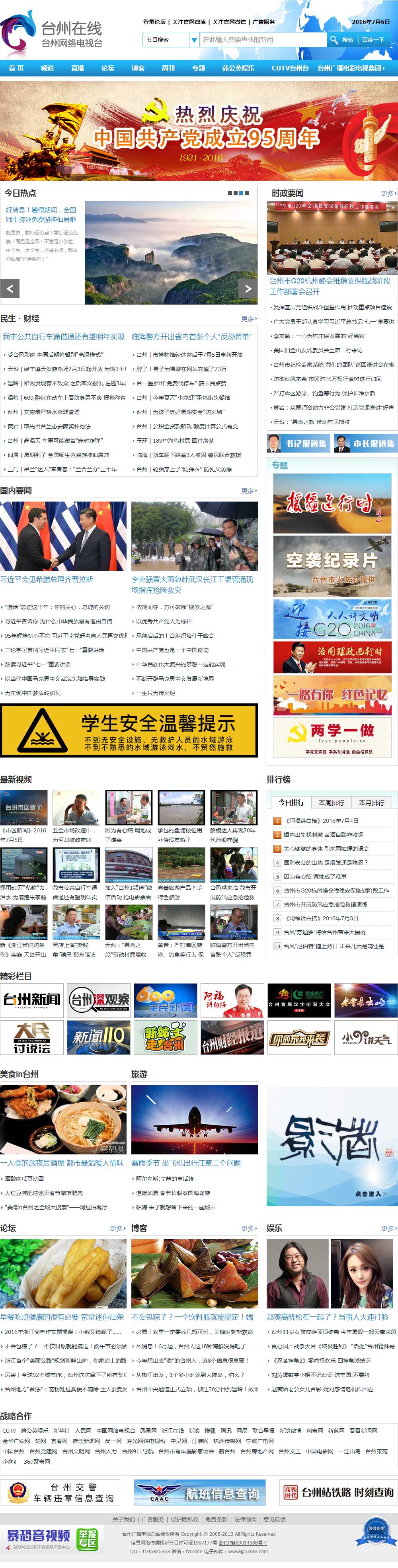 台州在线(www.576tv.com)" 网站是台州广播电视总台主办的跨媒体网络平台,以台州在线网为主平台,整合台州广播、电视、报纸和网络视频四大平台,多种媒体形式、内容资源、技术平台、传播渠道,努力打造台州网络新媒体。