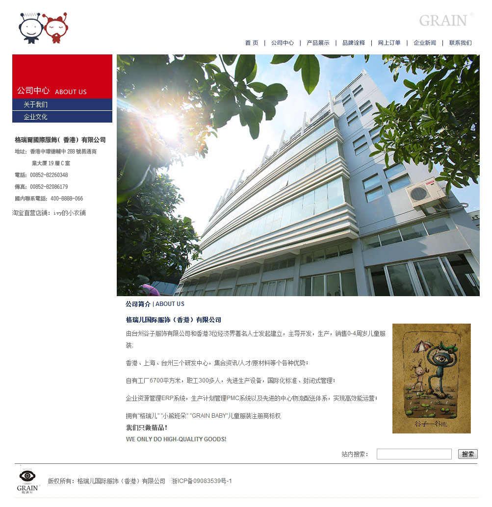格瑞儿国际服饰(香港)有限公司由台州谷子服饰有限公司和香港3位经济界人士发起建立,主导开发,生产,销售0-4周岁儿童服装;香港、上海、台州三个研发机构,集合资讯/人才/原材料等个各种优势;