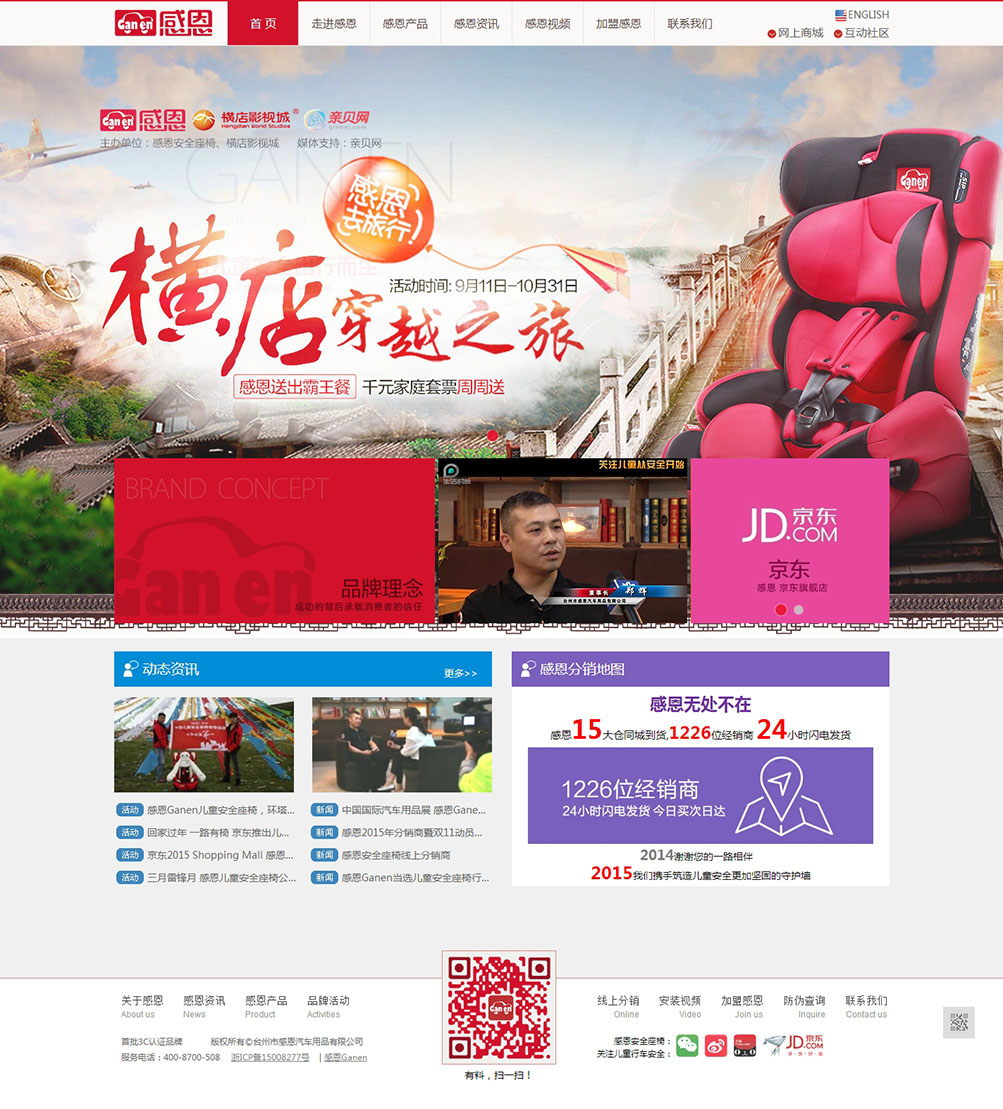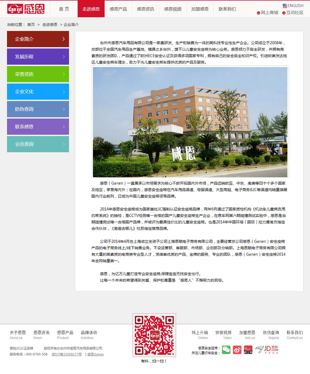 台州市感恩汽车用品有限公司是一家集研发、生产和销售为一体的高科技专业性生产企业。公司成立于2008年,总部位于全国汽车用品生产基地、模具之乡台州,旗下以儿童座椅为核心业务。感恩倾力于自主研发,并拥有高素质的研发团队,产品通过了欧洲ECE认证及获得多项国家专利,拥有自己的自主知识产权。引进欧美发达地区儿童乘车理念,致力于为儿童乘车提供产品及服务。