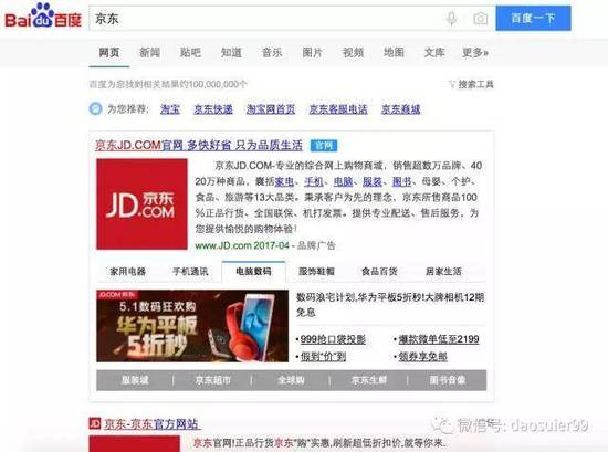 在投放首类关键词的情形下,很多企业,尤其是一些知名的企业还喜欢在搜索引擎里购买品牌专区,类似于我们在百度中搜索京东时展示区域所示。
